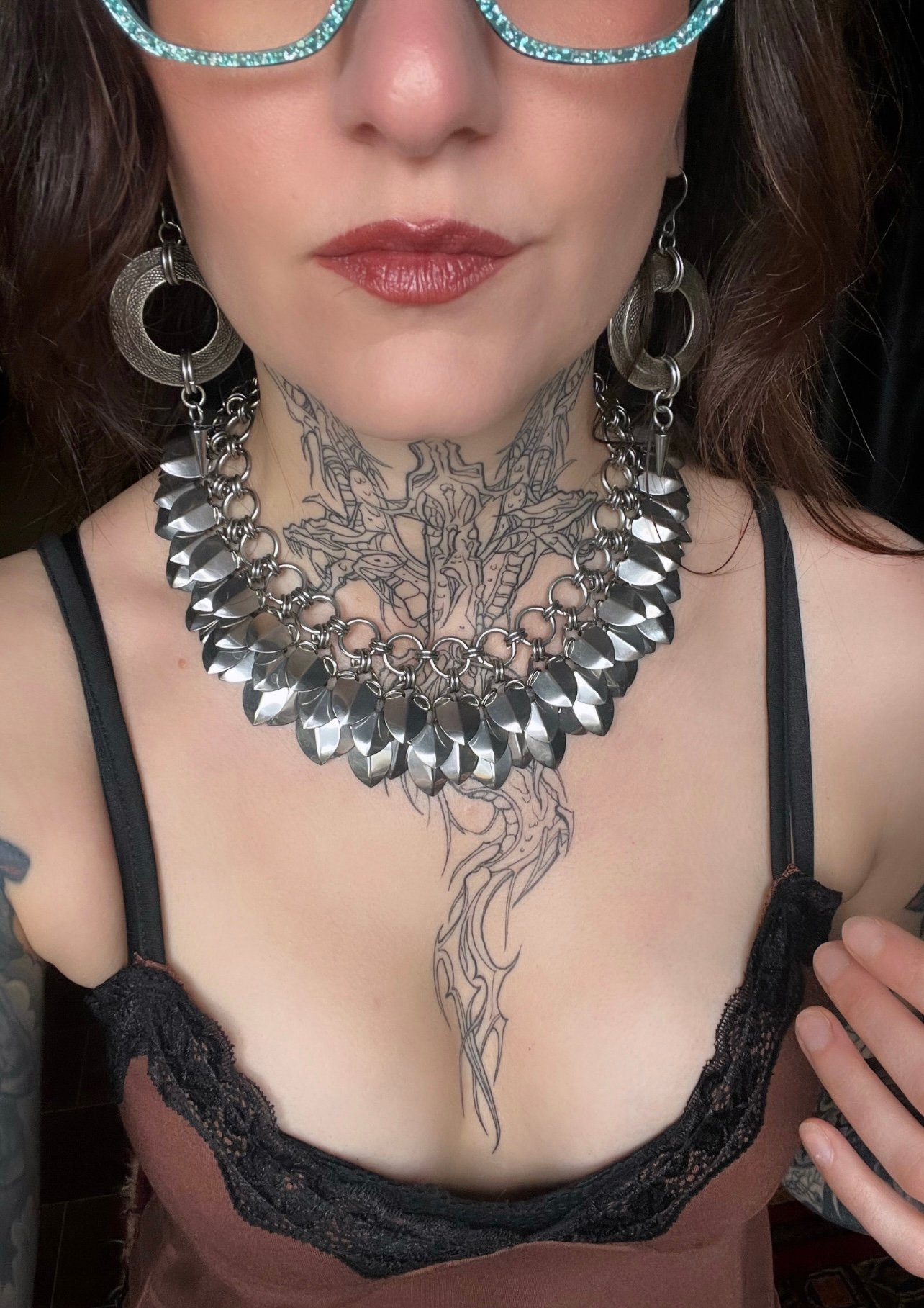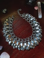 A simple chain collar with 4 layers of scalemaille fringe. All components 100% stainless steel. Each piece has an extending chain to adjust the length up to 3”.